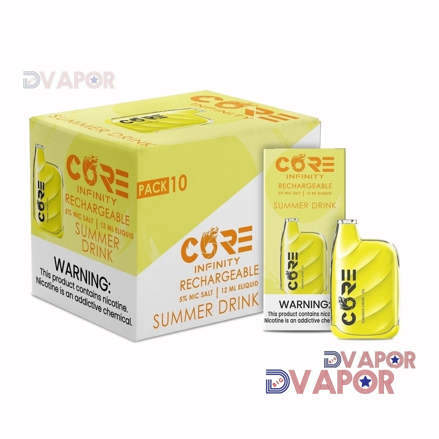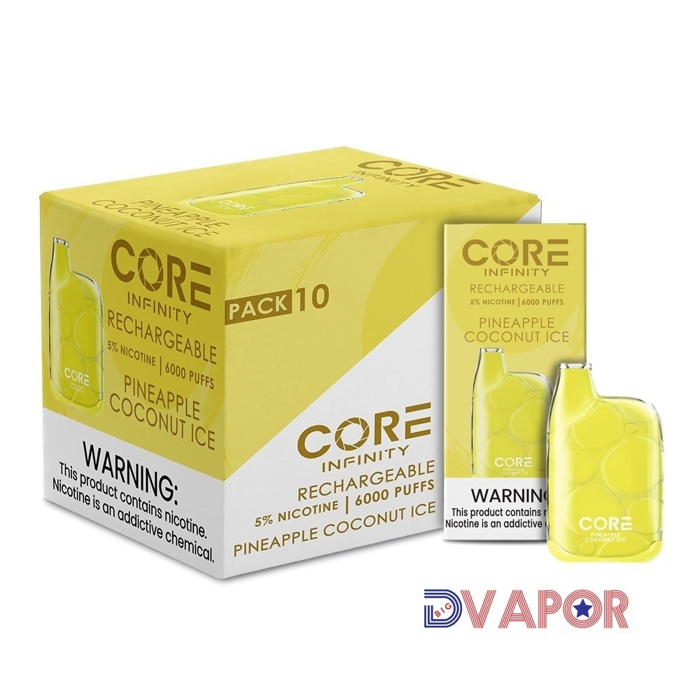 The Infinity CR6000, by Core Labs, is a 6,000 puff rechargeable 12ml vape with micro-USB input and a very stylized modern design. The Core Infiniti is features a mesh coil, large amount of airflow (non-adjustable) and a case that is encased with a heavy clear shell. Each Core Infiniti CR6000 has been designed in the USA with flavors fine tuned for American palates. We are currently stocking all flavors of the Core disposable; here's a full Core Infinity flavor list: