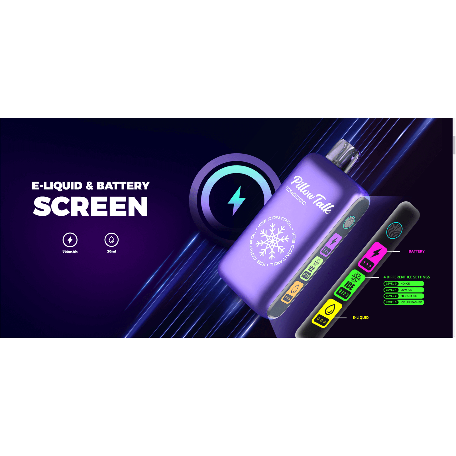 Introducing Pillow Talk IC40000, the world's first ice-controllable disposable vaporizer. With 4 levels of iciness and 15 delicious flavors to choose from, this device features dual Neo Mesh Coils, touchscreen control, adjustable airflow, and a fast-charging USB Type C input. Enjoy a giant 20ml e-liquid reservoir and a strong 5% / 50mg strength. Elevate your vaping experience with Pillow Talk IC40000. Here's a full Pillow Talk IC40000 Flavor List: